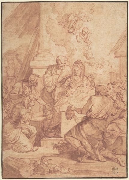Editor: Here we have Jean Jacques Lagrenée’s “The Adoration of the Shepherds” from 1762-1763. It’s a pencil and possibly ink drawing on paper, now a print, depicting the Nativity scene. The rough, unfinished quality of the line work makes the scene feel immediate and raw, rather than idealized. What catches your eye when you look at this drawing? Curator: What strikes me is the sheer labor implied in producing an image like this, even as a study. The repetitive, almost frantic, hatching that defines form and space points to the intense concentration and physical effort involved in creating an image during this period. What were the working conditions for artists like Lagrenée? How did the studio system shape the availability and affordability of art supplies? Editor: That’s a good point. I hadn't thought about the economics of art production back then. So, are you saying the materiality of the drawing itself, the pencil, the paper, even the act of drawing, informs our understanding? Curator: Precisely. Consider the hierarchy embedded in the art world: history painting versus genre scenes, oil painting versus drawing. This drawing, as a preparatory study, occupies a liminal space. It's a functional object, a tool in the production of "high art," but also a work of art in its own right. How does its status as a print further complicate its relationship to value and accessibility? Editor: So, the printmaking process democratizes the image, making it available to a wider audience but also distancing it from the artist's hand, from that original act of labor. Fascinating! It is also interesting to see that some smaller vignette scenes at the bottom border act like trials. Curator: Exactly. It forces us to think about art not just as an object of aesthetic contemplation, but as a product of material conditions, labor, and social forces. What implications do you think this analysis has for how we value art today? Editor: This reframes how I see art historical value; from artistic genius, toward art being valued also based on labor, access, and production means. Thanks for this new lens.