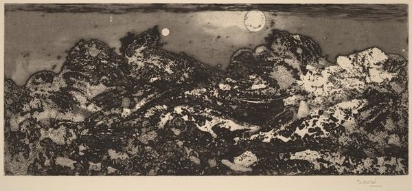 Hodaka Yoshida made this print, Earth, using aquatint, a process of etching that gives areas of tone rather than line. It’s like the earth itself: the artist digs in, and then something else happens, something alchemical. There's such great texture here, from the smooth blackness at the top to the granulated, lunar surface below. I love how the white specks dance across the black like distant stars, a universe unfolding from the depths of the plate. It's an image that breathes, expanding and contracting with each tiny variation in tone and mark. Look at the circles, and the jagged shapes scattered across the foreground. They remind me of Joan Miró, who also reveled in the magic of simple forms. Ultimately, this print invites us to contemplate the beauty and mystery of the world around us. I think that's what art should do – spark wonder and invite us to look a little closer.