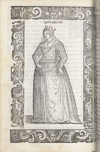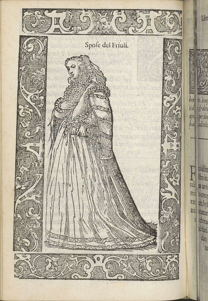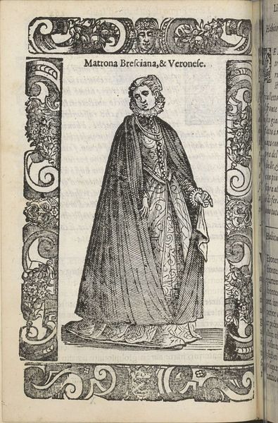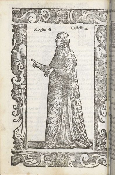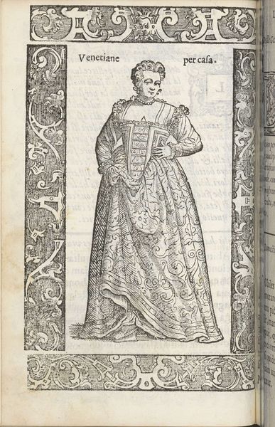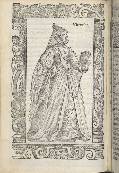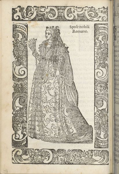 This is "Sposa di Padova", made by Christoph Krieger using woodcut. The artwork's formal presentation immediately strikes you. Framed by ornate pillars and decorative borders, the central figure fills the space, her elaborate gown cascading down in a series of complex folds. The monochromatic palette emphasizes the texture and depth achieved through varied line work. The artist's technique is interesting. Each line contributes to a sense of volume and material presence. Look closely at the gown's pattern, which suggests a rich brocade. Krieger employs a sophisticated use of hatching and cross-hatching to create subtle tonal variations, which bring the figure to life. This attention to detail speaks to a deeper concern with the structures of representation itself. Is Krieger inviting us to consider how clothing functions as a semiotic system? The attire communicates status and identity, acting as a complex code that signifies wealth and social position. By emphasizing these material details, Krieger draws attention to the ways in which meaning is constructed through visual and cultural signs. This invites endless interpretation and re-interpretation.