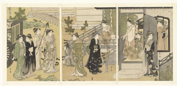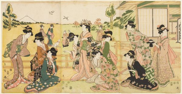Utagawa Toyokuni I created this woodblock print depicting courtesans of the Chojiya playing kemari, sometime between 1769 and 1825. In the Edo period, courtesans held a unique position in Japanese society; while ostracized, they were also celebrated for their accomplishments. Here, Toyokuni I offers us a glimpse into their lives, presenting them not merely as objects of desire but as women engaged in leisure and cultural pursuits. The game of kemari, a type of football, was a popular pastime among the elite, and their participation highlights their elevated status within the pleasure quarters. The presence of young attendants adds another layer, hinting at the complex social hierarchies within these establishments. Consider the elaborate kimonos, the carefully arranged hairstyles, all of which underscore the importance of image and performance in their profession. This print captures a moment of beauty but also invites us to reflect on the realities of these women's lives.