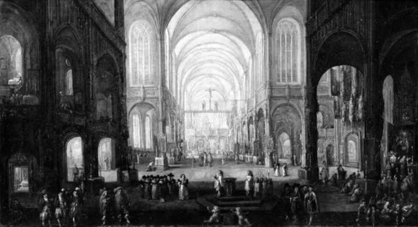 Curator: Jacob Balthasar Peeters created this piece, "Interior of a Catholic Church," in 1714. It is an oil painting on canvas, currently held at the SMK, the National Gallery of Denmark. Editor: The perspective in this piece really pulls me in. The high ceilings and long rows of columns create an amazing sense of space and depth, despite the rather limited tonal range. Curator: Absolutely. It’s a fascinating genre painting, showcasing the baroque style and employing complex architectural rendering. Peeters’s attention to detail extends not only to the architecture itself, but also to the individuals populating the scene. You can discern their clothing, postures, and interactions. Consider, for instance, the materials involved; the pigments used for the illusion of marble, the texture of the canvas supporting it. The canvas, likely produced by specialized weavers and then primed, represents an entire industry supporting the creation of "high" art. Editor: That checkerboard floor is masterfully done! It so strongly suggests receding space through variations in its shapes and values, even given the limitations of working in monochrome. But what does it all mean? Does the perspective device lead to the divine, or something else entirely? Curator: The use of perspective here does a great job reinforcing a sense of order, very important for this time in history, in sacred spaces like this. I would argue that Peeters is also exploring the burgeoning societal structures present in that time as reflected in religious architecture, its construction, funding, and ultimate influence. These spaces required countless artisans and laborers to manifest. Consider how that labour shapes the visual aesthetic. Editor: True. Thinking about form again, note how the architectural elements – the arches, columns, even the placement of figures – all serve to create a balanced, harmonious composition. There's this really interesting play between horizontal and vertical lines that gives it stability but also dynamism. Curator: Indeed. And that dynamism extends beyond the formal elements. The figures themselves are not static; they engage in conversation, prayer, contemplation. Each contributes to the atmosphere, a microcosm of daily life unfolding within a sacred context, constructed via a great collective of effort and trade. Editor: Looking closely, it is fascinating how the artist's choice of tone creates these effects. Even limited to these tones, the textures come alive, the architecture breathes. This play with structure and substance creates the whole illusion! Curator: Yes. By viewing the work through these lenses, we hopefully reveal much more about the conditions and resources required to bring a single painting like this into existence. Editor: I agree. Breaking it down this way makes one think about how this church became what it is, and that Peeters invites us to consider our understanding of buildings through artistic composition.