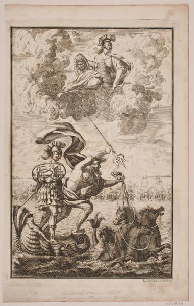 Curator: This etching is entitled "Ruiters in een landschap," or "Horsemen in a Landscape." Arnold Houbraken likely created it between 1681 and 1699. I’m drawn to the dynamic energy in the composition, despite the subdued palette. What's your initial reaction? Editor: There is indeed a striking energy present, particularly with the horse rearing up; its forward motion immediately conveys action. Yet the figures remain quite elusive, as though emerging from some shared cultural memory. Curator: It feels like a snapshot of power and privilege; the confident rider gesturing, almost imperiously. You immediately wonder about class and performance, considering how horsemanship historically has been intertwined with nobility. Editor: It makes me consider how the horse serves as a recurring symbol across countless cultures. From emblems of freedom and strength, to the vehicles of war and conquest, the horse represents our own projections. How do you read its symbolic place within the broader context of Dutch Golden Age art? Curator: That is interesting, given this was an era that valued burgeoning mercantile power more than the inherited right to it, generally. However, I read these kinds of genre paintings as constantly reasserting existing hierarchies within a changing social landscape, despite that commerce allowed for a more fluid class structure. The billowing clouds even evoke a sense of drama befitting a royal procession. Editor: Notice the seemingly classical architecture in the upper left. It may serve to create a deliberate connection between antiquity, with all its cultural and political authority, to the Dutch present. Curator: I see what you mean! Even this relatively small print seems loaded with complex historical tensions surrounding identity and aspiration in that period. I now see so much conflict. Editor: Yes, indeed, even such a preliminary drawing invites deeper consideration.