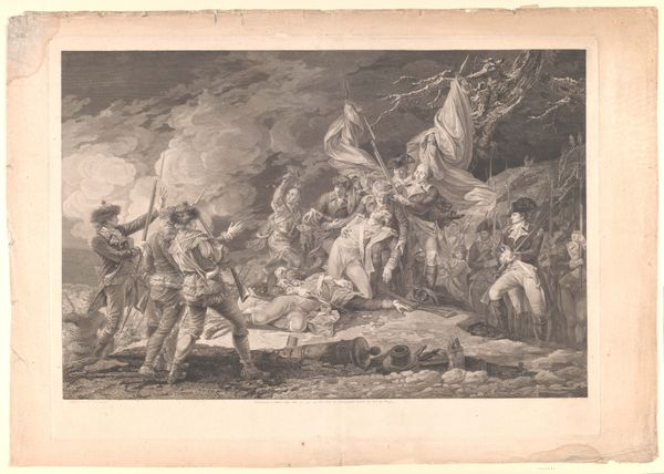 Editor: This print, "Death of General Montgomery" by Johan Frederik Clemens, captures a chaotic and tragic scene. There's so much drama in the composition, but also a sense of idealized heroism. What layers do you see in this depiction of war? Curator: It's crucial to remember that depictions of war often serve political agendas. Consider the power dynamics at play. Who is telling this story, and what message are they trying to convey about leadership, sacrifice, and the justification for conflict? How does this contribute to a nationalist narrative? Editor: So, it's less about historical accuracy and more about shaping public opinion? Curator: Precisely. The image of Montgomery becomes a symbol, divorced from the complexities of his life and the messy realities of war. What does this sanitization achieve? Editor: I hadn't thought about it that way. It's a powerful reminder that art can be a tool for shaping collective memory. Curator: Absolutely. And by questioning whose voices are amplified and whose are silenced, we gain a more nuanced understanding of history.
