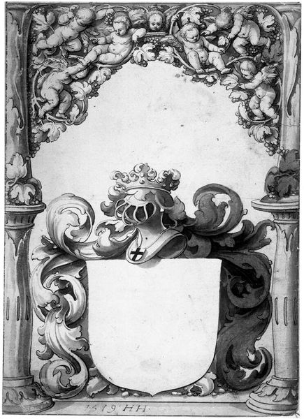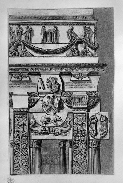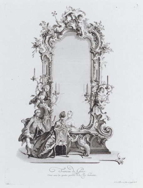 Curator: Jean Le Pautre created this engraving, "Oeuvres. Vols. I-IV", sometime between 1600 and 1700. What stands out to you right away? Editor: The overall impression is decidedly opulent, wouldn't you say? The scale, implied by the domestic setting, speaks volumes about wealth and privilege. The excessive ornament overwhelms the architecture. Curator: Precisely. The linear precision in the engraving style defines and emphasizes form, highlighting the intricacies of each motif: note the garlands, the cherubic figures adorning the mirror, the idealized forms holding the candlesticks. Editor: But who are these figures being memorialized through these decorative artworks? How do they perpetuate social stratification? The women holding up candles and other semi-nude figures underneath the table have no agency, carrying out the responsibilities expected of them. The artwork serves the needs of someone else and celebrates their identity. Curator: The print is interesting as a document of period aesthetics, revealing preferences for symmetry, elaborate embellishment, and classical references integrated into daily life. There is a certain playful tension between these elements, particularly the natural forms intertwined with strict geometrical lines. Editor: But playful for whom? Consider the power structures implicit in this type of extravagant display, not only from a gender perspective, but considering race and class as well. Who is not in the looking glass and who is holding it up? Curator: That's an astute observation that encourages a crucial debate. Viewing "Oeuvres. Vols. I-IV" solely through the lens of form might not provide the whole picture. Editor: Exactly, the engraving itself becomes a fascinating case study. I am particularly keen on pursuing these points further!