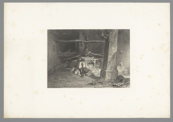 This "Orientalist Scene" was created by Alexandre-Gabriel Decamps using etching, a printmaking technique involving the use of acid to corrode the unprotected parts of a metal surface to create a design. The charm of this print lies in Decamps's manipulation of the etching process. Look closely, and you can see a multitude of tiny etched lines, capturing a wealth of tonal detail. These lines work together to build up the scene, creating both light and shade. The marks are the result of labor-intensive work on the metal plate, where the artist would have had to apply a resist, draw into it, and then submerge the plate in an acid bath. The result is a testament to the artist's mastery of his medium, turning an industrial process into a mode of artistic expression. Ultimately, it is the skillful process of etching that allows Decamps to translate his vision onto paper, inviting us to consider the relationship between artistic labor, industrial techniques, and cultural representation.