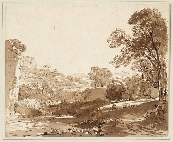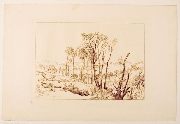 Curator: This is J.M.W. Turner's "Crowhurst, Sussex," a work held here at the Harvard Art Museums. Editor: Immediately, I'm struck by how light and airy it feels, almost like a fleeting memory. Curator: Turner masterfully employs line to define form and space. Note the strategic placement of trees, which create a rhythmic visual structure. Editor: It feels like the edge of something, doesn't it? The cusp of autumn maybe, or a half-remembered dream. There's a narrative here too, a quiet gathering of figures. Curator: Indeed, the figures introduce a point of human scale, enriching the interplay between nature and humanity, which is a recurring theme in Turner's work. Editor: It's a reminder of the delicate balance, how we’re just part of this larger, ever-changing landscape. Gives you pause, doesn't it? Curator: Yes, it does. The formal elements subtly underscore those deeper, philosophical implications.