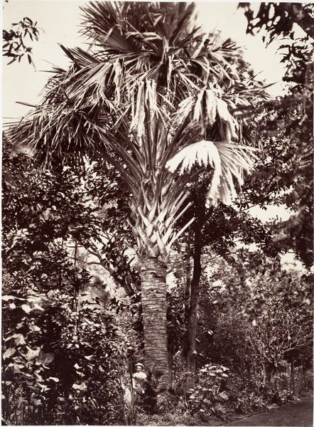 Curator: Let’s take a look at “Coronie,” a photograph by Hendrik Doijer, likely taken between 1903 and 1910. Editor: Well, right away, I get this sense of...humidity, you know? The heavy air just hangs there, doesn't it? All those drooping palm fronds. Curator: Exactly! Doijer captured a very particular environment, paying close attention to the indigenous materials in the setting. He was really focusing on this intersection of landscape and the people who lived and worked there. It depicts the specific environment, but also likely some sense of life and labor linked to coconut production in that specific place. Editor: There's something about the stark black and white too... it kind of romanticizes the hard labor that must've been involved. I'm imagining workers toiling under that sun, and then this photo almost turns it into a postcard. A rather eerie postcard, admittedly. Curator: That tension is central. We see the photographic techniques employed, such as realism to depict an objective scene of the landscape, and the composition highlights how these photographic methods interact with complex ideas of colonialism. Who is framing the scene? And how does that framing dictate the narrative of a faraway colony for European consumption? Editor: Oof, heavy stuff. And it all stems from these seemingly simple palms, rendered in monochrome. They’re both beautiful and haunting, knowing the context you give. I feel a responsibility in appreciating something beautiful, while at the same time appreciating the labor involved, and the artist's purpose. Curator: It speaks to the power of photography, right? How a single image can condense such complex realities, while simultaneously obscuring aspects through selection and technique. The choice of focusing on trees abstracts all other aspects and perspectives, creating, essentially, tropical orientalism. Editor: A reminder that even the most serene image carries a weight. I leave contemplating our place, our perspective, when it comes to capturing "paradise."