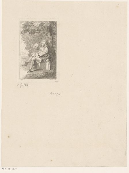 Editor: We're looking at "Boerin met hond" by Jan Stobbaerts, likely created between 1848 and 1879. It appears to be an etching, rendered in ink on paper. I'm struck by the quiet intimacy captured in this small, seemingly simple work. What stands out to you, observing the interplay of form and line? Curator: Initially, note how the artist structures space, a carefully balanced composition that draws the eye. The interplay of light and shadow, achieved through delicate lines and cross-hatching, suggests form. Consider how Stobbaerts contrasts the woman's posture with the dog's more relaxed form. Do you see how this interplay creates a visual dialogue? Editor: Yes, I see the contrast now. Her upright stance seems almost formal, even in this rural setting, while the dog is clearly at ease. How does the texture contribute to the artwork's message? Curator: The rough, almost raw texture of the etching, achieved through the artist's manipulation of the plate, adds a certain grittiness to the image, highlighting the everyday, lived experience. Consider the contrast in texture between the woman's clothing and the dog's fur. The artist carefully modulates texture to distinguish forms. How do you see this distinction influencing your interpretation? Editor: It emphasizes their bond but also her labor and his leisure. I hadn’t considered texture playing such a crucial role in defining social positions and relationships within the piece. Curator: Precisely. The materiality and method invite a rich layering of interpretations, moving past the purely representational. Such structural elements enhance meaning. Editor: This close formal reading is enlightening! Thank you, this detailed attention to composition, texture, and contrast opens up new ways to appreciate this work. Curator: Indeed. Exploring the artistic structures within a piece deepens our understanding of its effect.