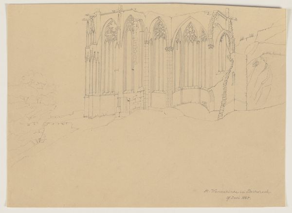 Curator: Here we have Friedrich Maximilian Hessemer's "Santa Croce in Florence," created as an etching, dating from 1827. Editor: It feels hushed, almost a memory. The lines are so delicate, barely there. A ghost of a building, shimmering into being. Curator: Indeed. Note the linear precision characteristic of etchings at the time. Hessemer employs line work meticulously to represent the scale and mass of the architecture. It's less about romanticising Florence and more about documenting it, using a reproducible method. Editor: But there’s a softness, despite the precision. It's not just a technical drawing. It makes you want to run your fingers along those stones. Curator: That speaks to the layering process itself. Consider the multiple passes of the etching needle and the immersion of the plate in acid. This act is very process oriented. Editor: All that work...yet it seems so effortless. You feel the weight, the history of Santa Croce. Did Hessemer experience something in Florence he translated in his image? Curator: Hard to say for certain. But remember, travel became more accessible during the 19th century, fostering interest in and demand for images of architecture and landscape, and etching was a cheap way to make them. The marketplace was demanding a specific type of souvenir. Editor: Still, even with the forces of the market in play, an artist can't help but infuse some part of their experience, don't you think? The very choice of this angle, that light... It feels deeply personal, rather than just commercial. Curator: The fact it exists as an etching, that's something any buyer of any budget could potentially acquire. That accessibility is interesting from a materialist point of view, because it suggests the architecture of Santa Croce wasn't reserved for elite viewership only. Editor: Maybe. But, personally, I’ll take my cue from the light, from how Santa Croce almost vibrates on the page... It invites introspection. Curator: Well, this piece certainly offers us a perspective into 19th-century modes of artistic production. Editor: And a glimpse of beauty rendered in delicate lines, whatever the circumstances.