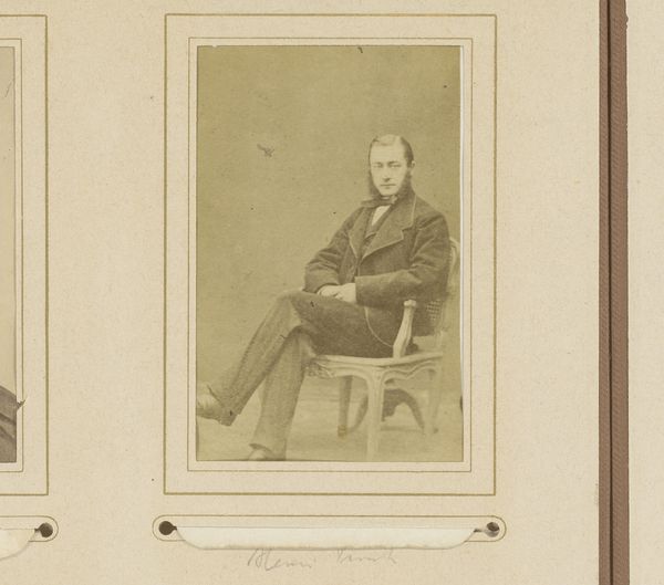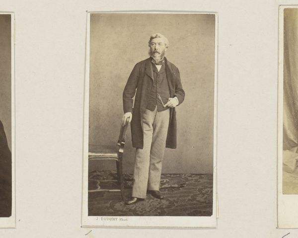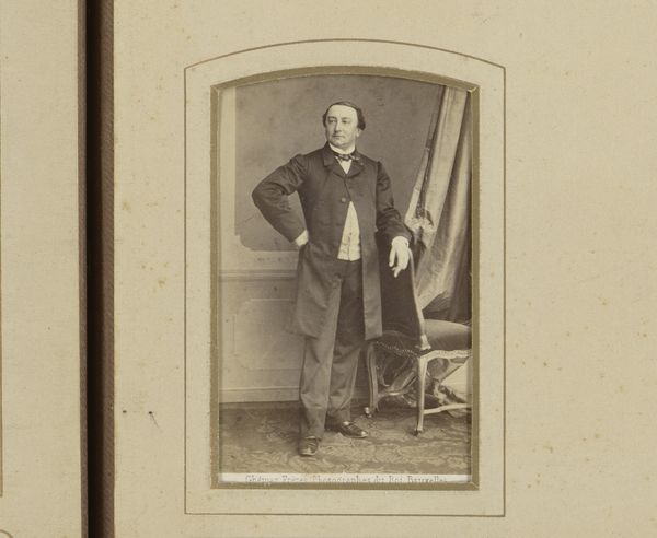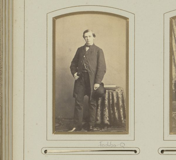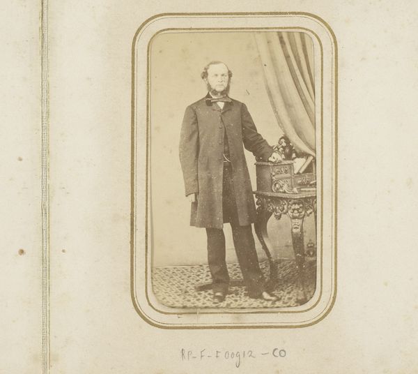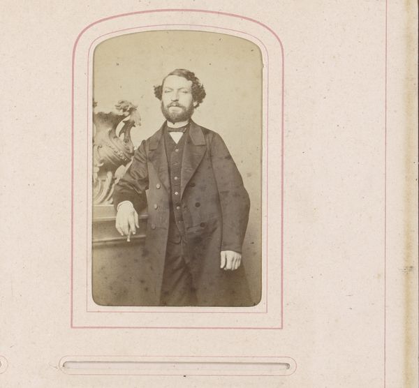 Editor: Here we have "Portret van Bastiaan de Greef staand bij een tafel," taken sometime between 1864 and 1879 by Leonard de Koningh. It’s an albumen print, giving it this wonderfully sepia, old-world feel. The man himself looks quite serious, almost as if he is acting for posterity! What draws your eye when you look at this photograph? Curator: Oh, you’re right; he *is* posing for eternity, isn't he? For me, it’s the light. See how it sculpts his face, particularly around the brow? Makes him look like a Roman bust unearthed from centuries past! And that little flick of shadow under his cheek – masterful. It’s odd how staged photographs from that period now radiate something almost alien to our contemporary candid sensibilities. Have you felt that? Editor: Absolutely! There’s a deliberate artificiality, and, honestly, something strangely touching about it. The way they curated their own image. Almost theatrical. But where do you think the realism comes in? Curator: Good question. Despite the posed nature, it’s brutally honest. There’s no airbrushing, no digital magic, just him, standing there with all his imperfections – you can almost feel his nervousness and resolve mixed together. We're not just looking at de Greef; we are contemplating our strange urge to stop the clock! And I always enjoy pondering the photographer's part too: were they friends, rivals, lovers, or strangers? Each encounter could change everything... Editor: It’s a far cry from a modern selfie! I hadn't considered all the complex social possibilities. Thinking about this makes me reconsider those studio portraits with a renewed appreciation for a specific type of performance. Thanks! Curator: My pleasure! Photography is a funny old mirror, and thinking about how that reflection ripples across time helps make sense of what has been left behind.