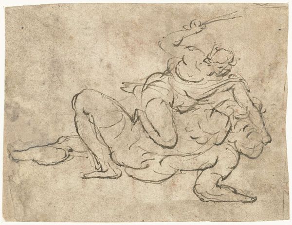 Jacopo Tintoretto's sketch presents a figure captured in charcoal, poised in dynamic tension on muted paper. The composition centers on the kneeling man, his form delineated by brisk, energetic lines that convey movement and weight. The sketch is dominated by curved lines in the man's body and clothing which contrast with the angularity of his limbs. Tintoretto masterfully employs line to suggest depth and volume, especially in the drapery and musculature. These visual elements suggest a moment of contemplation or supplication, imbued with a sense of drama typical of the artist's style. The lack of background focuses attention on the figure, allowing us to study the expressiveness of the posture. The sketch destabilizes the traditional static poses often seen in Renaissance art, by capturing the figure mid-action. This artwork emphasizes the transient nature of human existence. It invites us to reflect on the body as a site of action, emotion and spiritual expression.