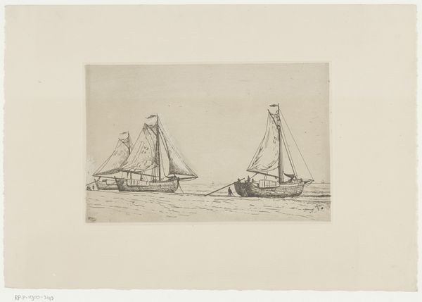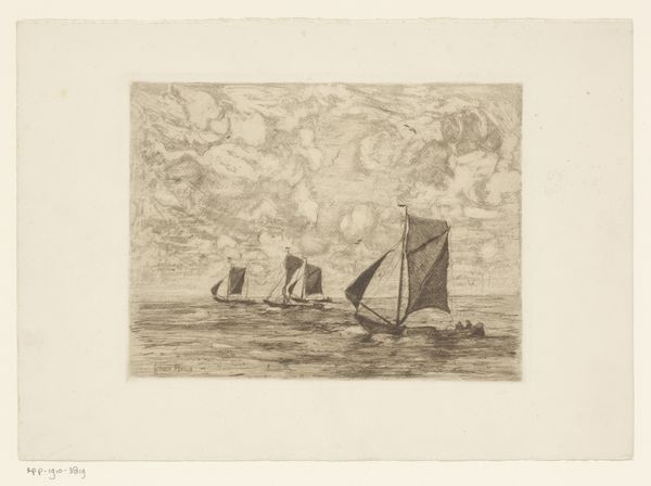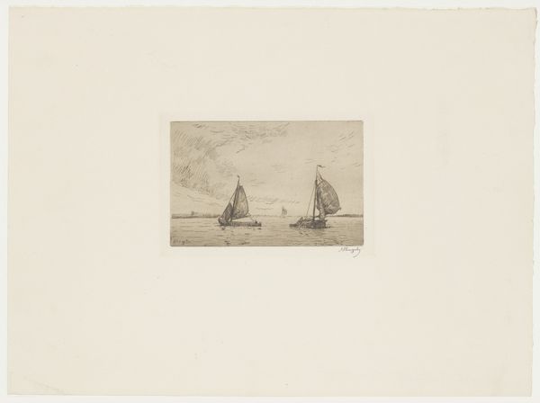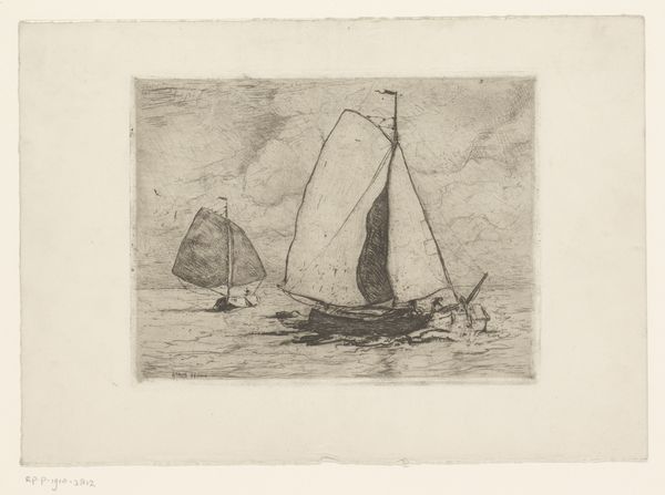 Frans Hens created this etching, titled 'Zeilschepen op de Schelde,' during a period when maritime scenes captured both the industrial activity and serene beauty of waterways. Hens, born in Belgium, lived through a time of significant change in maritime technology and trade, which influenced his artistic focus. His choice of subject matter reflects the economic importance of the Schelde river, vital for trade and transportation, but it also evokes a sense of the daily lives of those connected to it. The monochromatic palette reduces the scene to its essential forms, emphasizing the texture of the water and the sails. The etching technique lends itself well to depicting the nuanced light and atmospheric conditions typical of coastal regions. Hens invites us to consider our relationship with the natural world and how it intertwines with human industry and identity. The image encourages a moment of quiet reflection on the historical narratives embedded in everyday landscapes.