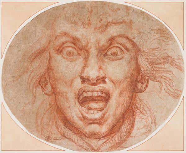 Editor: This is Eduardus Jacobus's drawing, "Despair," from after 1698, currently residing at The Art Institute of Chicago. It appears to be done with graphite, chalk, and other drawing media on paper. It’s pretty intense; that expression is almost painful to look at. What do you see in this piece? Curator: Indeed! Jacobus masterfully uses physiognomy here; the artistic study of facial features to reveal inner character. Notice the emphasis on the exaggerated wrinkles around the eyes and mouth, and that furious hair. This taps into a long tradition – think of the classical "Mask of Tragedy." Do you see how those shared visual cues trigger an immediate emotional response in us, even centuries later? Editor: So, you're saying it's kind of a shorthand for "anguish"? It's interesting how consistent those symbols of distress have remained. Is the text at the bottom part of the original artwork, too? Curator: Exactly. And yes, the text is integral. It serves as a clinical analysis of the expression. But even without the words, we instinctively understand what Jacobus is conveying. These exaggerated expressions of emotions became crucial in theatrical and artistic representations. It aimed to depict universal human experience. Editor: I get it. It is fascinating to see that artistic pursuit to visually capture, preserve, and distill emotional experiences and expressions across centuries. Thanks for elaborating. Curator: My pleasure. The universality of these visual cues underlines how profoundly images shape and carry our collective cultural memory, in ways that text just cannot.