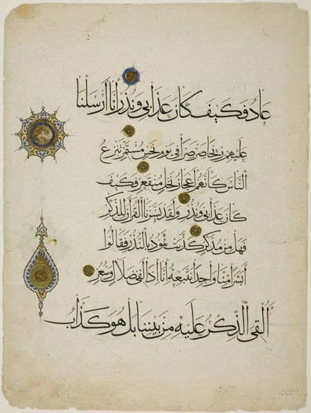 Curator: Here we have folio 51 from a manuscript of Dala’il al-Khayrat, or “Prayers for the Prophet,” housed at the Harvard Art Museums. Editor: Its immediate impact is one of reverence. The compressed script and gilding create a tangible sacredness, wouldn’t you say? Curator: Indeed. The text and its visual presentation served a specific devotional purpose. Manuscripts like this were often commissioned by wealthy patrons as acts of piety. Editor: Look at the interplay between the red and gold lettering. The angularity of the script against the curved lines gives it a sense of layered depth. Curator: The use of gold elevates its status, reflecting the importance placed on the words themselves. One can consider how this work was part of a larger religious and artistic landscape. Editor: The composition certainly invites contemplation on the power of language, visually and spiritually. Curator: Precisely. It offers a glimpse into both artistic skill and devotional practice.