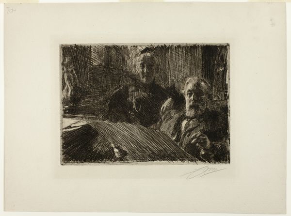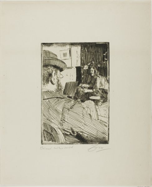 Curator: Anders Zorn created this etching, entitled "The Little Brewery," in 1890. It's a genre painting offering a glimpse into a bustling interior scene rendered in ink on paper. Editor: Ah, my first impression is... busy! But in a cozy way. The strokes are like quick glances, capturing the hustle and bustle. The atmosphere feels warm, maybe a little boisterous? I can almost smell the yeast and hear the chatter. Curator: That warmth likely resonates with Zorn's intent. He often depicted scenes of everyday life, elevating ordinary people and settings to the realm of art. Genre painting like this really took off in the 19th century as art started to move away from only depicting historical or religious subjects. Editor: It definitely has that sense of capturing a specific moment, right? Look at the way the figures are arranged – some actively working, others relaxing in the background. It’s like he's giving us permission to eavesdrop on their day. Curator: And Zorn's skillful etching technique lends itself perfectly to that intimate feel. The dense network of lines creates a sense of depth and texture, but it also allows for areas of light and shadow that create a captivating contrast and give energy to the overall image. Editor: The etching reminds me of controlled chaos! All those lines giving shape to form, giving a feeling of controlled wildness and making me want to step into this world. The looseness of it all – so refreshing! I like it more each time I look at it. Curator: The composition reflects the social hierarchies within the brewery. The central figure, perhaps the brewmaster’s wife, is elevated and commanding, whereas other patrons are literally backgrounded. So this is as much a glimpse of production as it is of society itself. Editor: Knowing that shifts my perception, absolutely. I like how my first, gut feeling response meshes with the history to offer something far richer. Curator: Ultimately, pieces like this challenge the notion of who and what is "worthy" of representation in art. Zorn, by choosing to depict ordinary working-class people in their daily environment, asserted their inherent value and significance. Editor: Yeah. You know, sometimes the most profound stories are found in the simplest of moments. Thank you for adding richness to that. Curator: Indeed. Every line and shadow has something to tell.