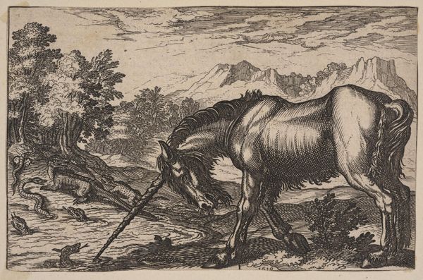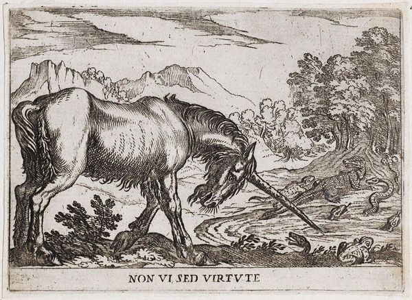 Editor: Here we have Antonio Tempesta's engraving from 1600, “A Unicorn Chasing Lizards from a Pond." What strikes me first is the contrast between the rather sturdy, almost muscular unicorn and the teeming little ecosystem it’s disrupting. It feels… chaotic, but in a purposeful way. What do you make of it? Curator: Oh, chaos with purpose! I love that. It makes me think of those moments when our most cherished beliefs – unicorns, virtue, whatever you like – crash headfirst into the messy reality of life, represented by those startled lizards and snakes. Virtute...virtue alone triumphs? I'm not so sure Tempesta thought so. Look at that sky, pregnant with storm. Is the unicorn actually saving anything or just…stirring the pot? Editor: That's a great point about the virtue. I was taking it at face value. The sky does give it a very different feel – more ominous. So, maybe it's not about simple heroism? Curator: Exactly! Perhaps it's a commentary on the limitations of idealistic thinking when confronted with the complicated realities of the world. We think we're doing good, banishing those metaphorical 'lizards', but maybe we're just…making things worse. It's like trying to solve a problem with a sledgehammer! I find the landscape, almost violently teeming, speaks to an anxiety of the time. Editor: I see that, the close observation of detail even when representing mythological and imaginative events is powerful. So it’s like, good intentions aren't always enough, and sometimes you just end up disrupting the pond for everyone? Curator: Precisely! Or perhaps… virtue requires a little bit of dirt under its fingernails. After all, the unicorn's horn is pointed right into the water. Perhaps a bit of uncomfortable immersion is the only way to make real change? Editor: Wow, I didn't think about it that way at all. So much more going on than a simple "good versus evil" scenario. Curator: It never is, is it? And that’s what makes art so endlessly fascinating. Thanks, Tempesta, for the chaos! Editor: Indeed. It’s something to ponder!