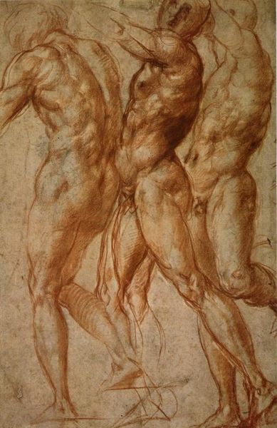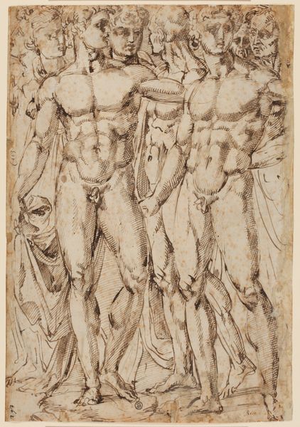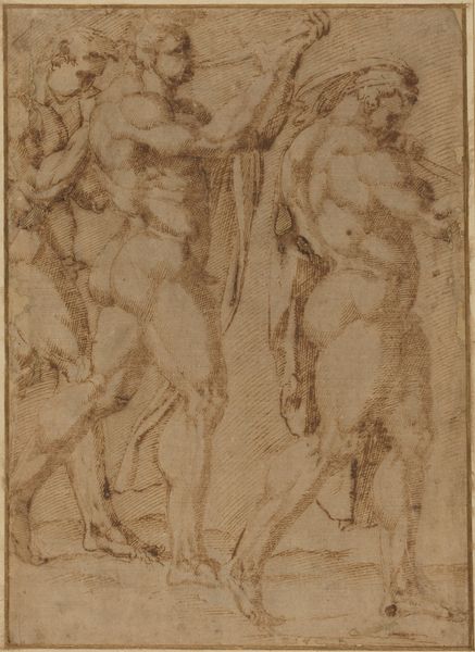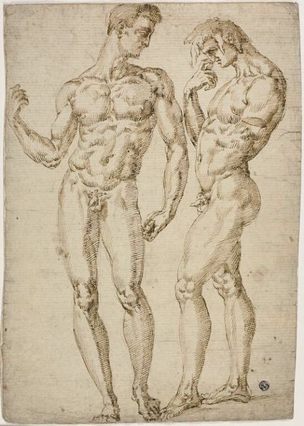 Curator: It's stark, isn't it? Immediately I see tension; muscles taut, poised... ready for action, perhaps? There is also something fragmented and unfinshed in its feel, an immediacy that speaks across the centuries. Editor: Indeed. We're looking at a drawing from around 1520, attributed to Baccio Bandinelli, titled "Two Male Nudes." Executed in ink, its place in art history lies in its example of Renaissance draftsmanship, and its role in Bandinelli’s process, as it highlights the Renaissance concern with idealized male form. Curator: Idealized yes, but also weaponized! One figure seems to grasp the hilt of a sword. Considering Bandinelli's role within the Florentine art scene, do you see echoes of political struggles represented through these hyper-masculine forms? Were these figures meant to symbolize strength during a volatile period in Florentine history? Editor: The power dynamics within the Florentine Republic were certainly in constant flux during this period, particularly with the rise and fall of the Medici. It’s possible that Bandinelli, who was often in competition with the likes of Michelangelo and other prominent artists, consciously crafted these figures as embodiments of strength in order to, in a sense, display a forceful masculine power of his own... an artistic one as much as anything else. Curator: I agree, but there may be room to explore the dynamics of that rivalry beyond male aggression. I wonder if this preoccupation with the male form further cements notions of dominance within society? Was there a conscious effort to erase other identities to champion an idea of power rooted in idealized, male anatomy? This work can be interpreted as participating in a very particular construction of masculine authority and power. Editor: That’s a valid reading. And yet, when analyzing these power dynamics, one can consider the complex patronage system prevalent at the time. Artistic choices were rarely entirely independent. Patrons, often powerful families or institutions, would influence, and even dictate, subject matter and style to promote their own agendas, and it’s equally valuable to note their contributions to the works displayed for their publics. Curator: Ultimately, Bandinelli's drawing remains a powerful exploration of the male form, sparking conversation centuries later. Editor: A testament to the ongoing dialogue between art, history, and identity, then.