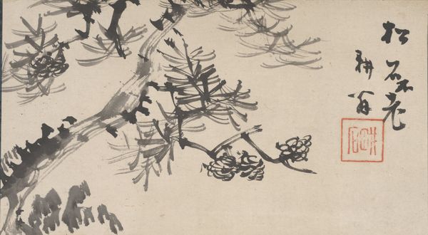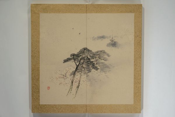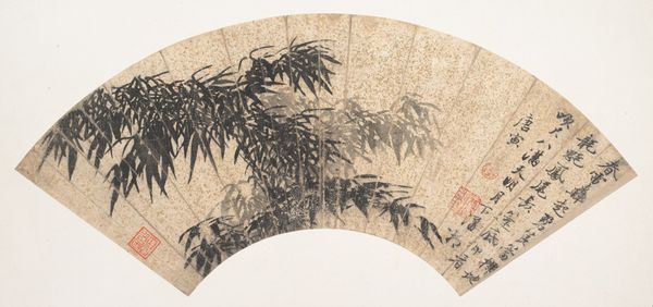 Editor: We’re looking at “Landscape with Fisherman,” created in 1643, by Qi Zhijia. It’s done with ink and watercolor on paper and rendered in a fan shape. The composition feels quiet, almost melancholic. What do you see in this piece, and how do you interpret its visual language? Curator: This isn't just a picturesque scene; it’s a carefully constructed visual argument about humanity’s place within the cosmos, deeply rooted in Daoist philosophy. Notice the fisherman, almost imperceptible, a tiny figure on the water. How does that scale speak to power dynamics, not just between humans and nature, but perhaps within the societal hierarchy of the time? The mist, the mountains… are these idealized spaces or commentaries on lived realities? Editor: So, it's not necessarily a literal landscape? It's more symbolic? Curator: Exactly. Consider the political context. 1643 places this artwork near the end of the Ming Dynasty, a time of intense social upheaval and political instability. Are those blurred edges of the mountains and the insubstantial form of the fisherman suggestive of a dissolving order, a world in flux? Are the sparse details meant to be a subtle act of resistance, by drawing away from worldly subjects? What silences exist here? Editor: The fisherman, who I initially saw as peaceful, now seems almost vulnerable within such a vast landscape...or perhaps he is quietly resisting, finding solace in nature? Curator: Precisely. The beauty and perceived harmony in the landscape contrast the societal imbalances during this era. It gives us space to think about how nature has long served as a canvas for expressing political and personal desires or frustrations. Editor: I see the landscape paintings of the era in an entirely different light. Thanks. Curator: Indeed. This is what can happen when we apply interdisciplinary theoretical models.