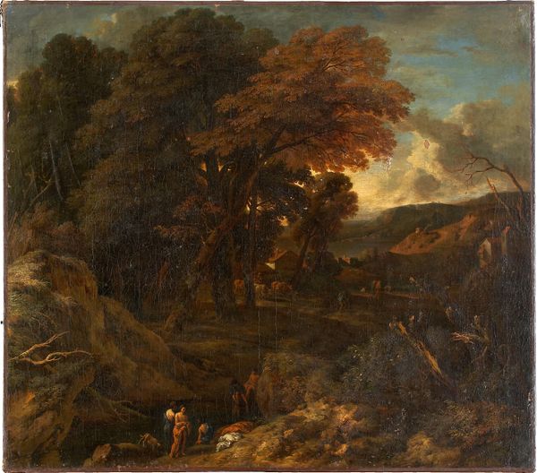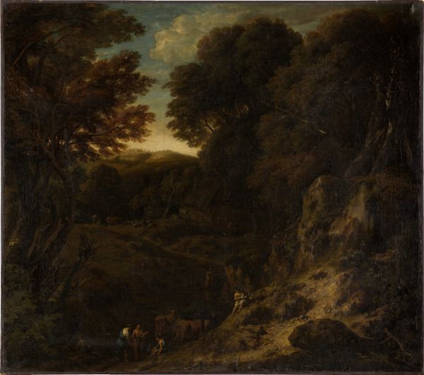 Jan Wijnants painted "Dune Landscape with Hunters Resting" using oil on canvas. The composition arranges the flat Dutch landscape into diagonal masses of earth and sky. This division guides the eye from the foreground figures resting by a pool to the distant horizon. Wijnants employs a limited palette of earth tones, punctuated by the pale sky and foliage. These elements, while representational, evoke a sense of space that is carefully constructed. Note the use of texture; Wijnants’ brushstrokes are visible, particularly in the foliage and clouds, emphasizing the materiality of the paint. This technique moves beyond mere representation, inviting the viewer to consider the painting as an object. The scene reflects a move towards naturalism in Dutch landscape painting, yet the careful arrangement reveals an underlying structure. It's a constructed reality, where nature is presented through a lens of artistic order and invites us to contemplate the structures that inform our perception of the natural world.