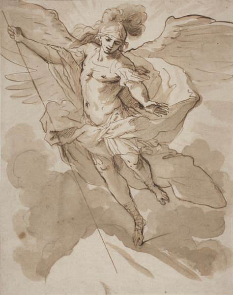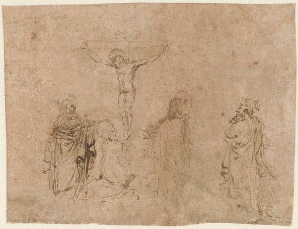 Curator: This is Carle van Loo’s drawing, "Christ on the Cross," a compelling piece rendered in chalk and intaglio, currently residing at the Art Institute of Chicago. The starkness of the lines really gets to me. What are your initial thoughts? Editor: It's very raw. I’m struck by the vulnerability in Christ's pose. The drawing isn't overly polished; it feels like an intimate study. How do you interpret this work within its historical context? Curator: I see it as van Loo grappling with power, suffering, and representation. Consider the history of religious art, often used to reinforce hierarchies. But here, the academic style is undercut by the raw emotion, presenting Christ’s body in a state of pain and nudity. Does this evoke any thoughts about the intersections of class, gender, or social status at the time this was made? Editor: It makes me think about who this piece was for, and what kind of empathy it sought to create in its intended audience. Was it perhaps intended to humanize Jesus and challenge existing power structures? Curator: Precisely! It's challenging to think about this image without understanding France's role in the construction of race and the gendered notions of sacrifice at the time. By depicting Christ so vulnerably, is van Loo inadvertently commenting on the vulnerability of other marginalized groups? Editor: That's a powerful reading! I never considered the drawing as a social commentary beyond its immediate religious subject. Curator: Art, even religious art, can function as a mirror reflecting the anxieties and unspoken tensions of its time. It urges us to question who gets to be seen, whose stories are told, and whose bodies are put on display. Editor: This conversation has given me a new perspective on the layers of meaning present in this drawing. Thanks! Curator: Indeed. Analyzing artwork such as this is about looking beyond the surface and connecting it with broader historical and social conversations that resonate even today.
