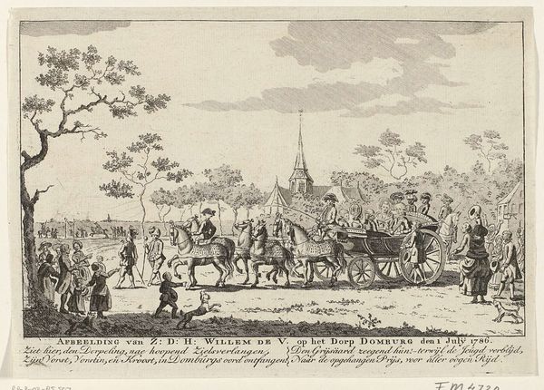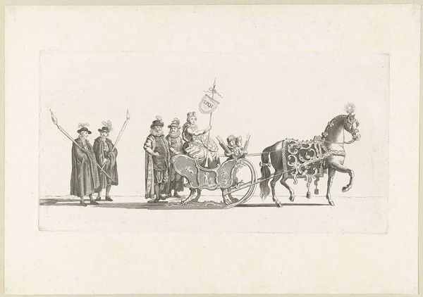 Around 1785, Daniël Veelwaard created this print depicting a Rhetoric Society procession in Middelburg, now held in the Rijksmuseum. The composition, rendered in precise lines, captures a street scene dominated by a horse-drawn cart carrying members of the society. The architectural backdrop is as relevant as the spectacle itself. Veelwaard's choice to meticulously detail both the figures and the environment creates a structured tableau. The procession and architectural setting function as signs that engage with the cultural codes of 18th-century Dutch society, where rhetoric societies played a crucial role. These societies, which were dedicated to the study and practice of public speaking and literature, were cultural institutions that shaped intellectual and artistic life in the Netherlands. The print offers a glimpse into the values of the Dutch Golden Age and its interest in civic representation. It captures how communities organized and presented themselves, reflecting the era’s emphasis on communication, learning, and public life.