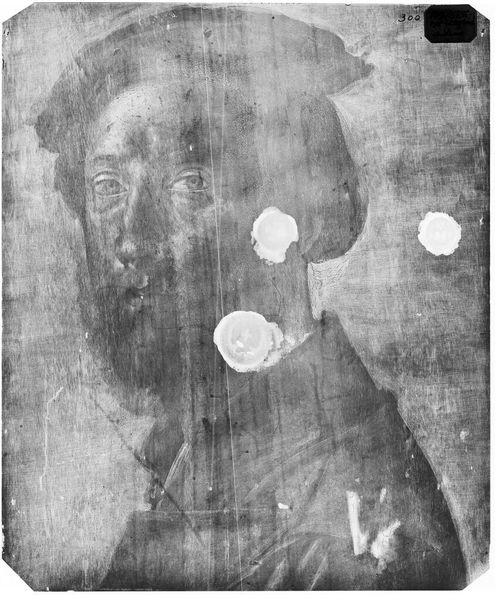 Curator: This is an X-radiograph of a portrait of Martin Luther, originally by Lucas Cranach the Elder. The film itself measures about 8 by 10 inches. Editor: My first impression is one of stark revelation; it's like seeing beneath the surface, not just of the painting, but of the man himself. Curator: Absolutely. X-radiography offers a glimpse into the artist's process, revealing underdrawings and pentimenti—changes made during the painting's creation. It gives us a forensic view of an iconic image. Editor: The stark contrast amplifies the lines and forms, abstracting Luther into a network of shapes. It’s fascinating how the familiar face is rendered almost alien. Curator: And consider Luther's enduring image, meticulously crafted by Cranach. The radiographic distortions remind us that even the most powerful symbols are subject to time and decay. Editor: Seeing the inner structure does change my appreciation for the finished work. It's a potent reminder of the layered nature of representation.