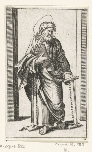 Curator: This is Illustration XXVI, by an anonymous artist. The piece currently resides here at the Harvard Art Museums. Editor: There's a somber weight to the figure—a sense of quiet authority emanating from those stark lines. Curator: Absolutely. The linear woodcut technique itself speaks to a specific historical context, one where the material conditions of printing shaped the visual language of disseminating knowledge. Editor: And that robe! The labor involved in creating or even just obtaining such garments must have been considerable. The rosary also has its own form of material significance. Curator: Precisely. These visual cues aren't just about status but also about the intersections of power, religion, and identity in the depicted society. The male figure’s identity is linked to a social-political role. Editor: It makes me think about the physical act of carving this block, the repetitive gesture and the skill. How much it reflects the work of many hands. Curator: By understanding these intersections of history, labor, and form, we can better address the present and futures in which art functions. Editor: I agree. Considering these historical works really contextualizes our current methods of art-making and material consumption.