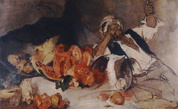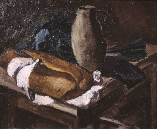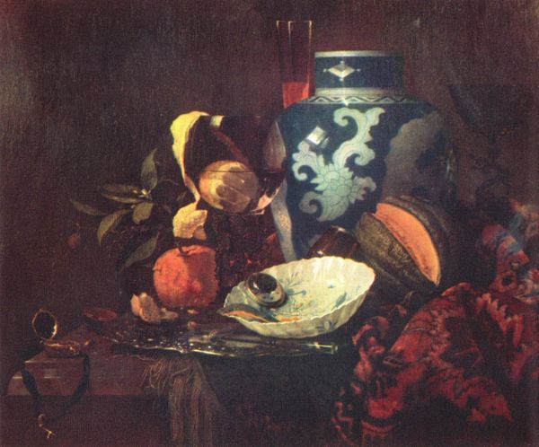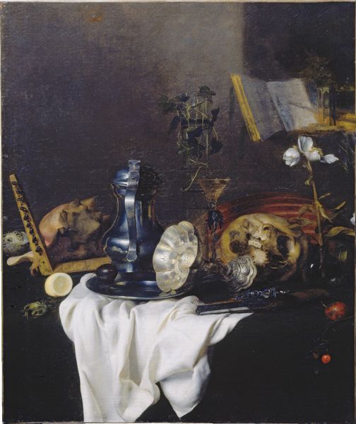 Cornelis Norbertus Gysbrechts created this oil painting, titled "Nature morte aux poissons," around the mid-17th century. The composition is dominated by a dark background that throws a selection of carefully arranged objects into sharp relief, focusing attention on their texture and form. The rough scales of the fish, the soft texture of the bread, and the cold gleam of silverware play against each other, creating a rich sensory experience. The arrangement creates a strong horizontal emphasis, with the objects placed on what appears to be a draped table, giving the image a sense of order. Gysbrechts destabilizes the traditional still life by including decaying fish. The inclusion of these elements serves as a stark reminder of mortality, a vanitas motif. The contrast between the opulence of the silverware and the perishable nature of the fish offers a meditation on the transient nature of earthly pleasures. The work challenges fixed meanings of beauty and decay and forces us to confront uncomfortable truths. The horizontal emphasis functions as a stage for contemplating the interplay between life, death, and material existence. The painting then becomes more than a still life; it's a profound statement on the human condition.