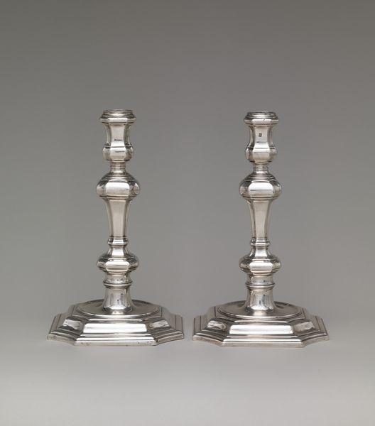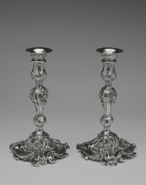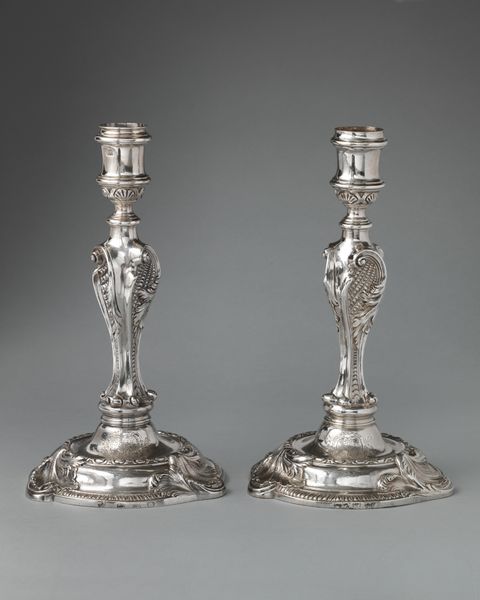 Editor: Here we have a pair of Baroque-style candlesticks made of silver by Thomas Merry I, dating back to 1713-1714. They feel so rigid and formal, how do you interpret them? Curator: I see these candlesticks not just as functional objects or displays of wealth, but as potent symbols of power and hierarchy within 18th-century British society. Silver, especially pieces like these, was primarily accessible to the elite, reinforcing their dominant social position. The symmetry, a classic Baroque element, embodies the desire for order and control characteristic of that era. Editor: Order and control? Could you elaborate on that in terms of their function? Curator: Absolutely. The act of lighting these candlesticks – imagine them illuminating a lavish dining table or a formal gathering. Light in this period was not just about visibility; it was about setting the stage for social performances, about accentuating status, and quite literally, about who could afford to 'shed light' on matters. Editor: That’s interesting. So even something as simple as owning these shows your status in society at the time? Curator: Precisely! Ownership granted one visibility and social influence. We must consider how the production of these silver pieces depended on the labor of marginalized people, obscuring those exploited realities under a veneer of aristocratic elegance. Editor: I never thought about that, thanks for highlighting the labor aspect of its history. These were not just ornate; they held socio-political value that still resonates. Curator: Indeed, reflecting on the power structures these objects represent prompts critical dialogues about the distribution of resources, access to visibility, and enduring inequalities in contemporary society.