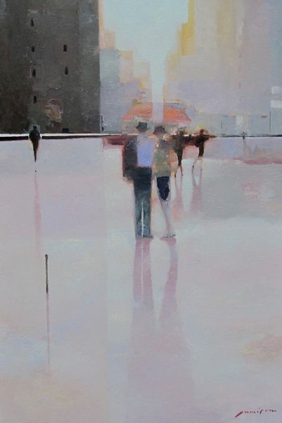 Jeff Jamison created “Spaces & Places” using what appears to be oil paint to capture an urban scene. The painting is dominated by the interplay of light and reflection on a wet surface, evoking a sense of fleeting moments. The artist employs a structural framework of vertical and horizontal lines, dividing the composition into distinct spatial zones. The figures are rendered with swift brushstrokes, almost as structural elements, challenging traditional portraiture. This is evident in the reduction of human forms to mere suggestions, their presence defined more by gesture and posture than by detail. The formal arrangement invites us to consider how Jamison’s painting destabilizes the conventional notion of urban scenes by blurring the boundaries between space and subject. The artist's manipulation of paint and form serves a purpose beyond mere representation, suggesting a deeper inquiry into the nature of perception and reality. This painting exists as an open-ended experiment in form and spatial perception.