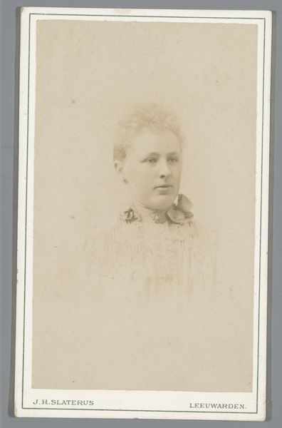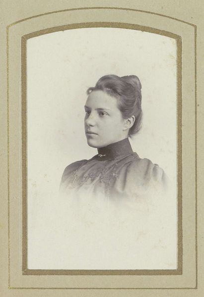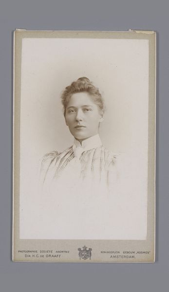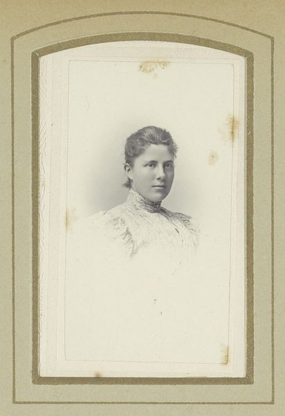 Editor: Here we have "Portret van Heleen Waller," a photographic portrait dating from between 1892 and 1897 by Koene & Büttinghausen, housed in the Rijksmuseum. It strikes me as such a formally composed image, almost austere. What do you see when you look at it? Curator: This portrait, while seemingly straightforward, sits within a fascinating historical context. The rise of photography democratized portraiture, shifting it from the realm of the wealthy to a wider segment of society. It reflects changing social values and aspirations of the rising middle class in the Netherlands during the late 19th century. Think about the studios themselves – what kind of experience do you think they were crafting for their customers? Editor: So, beyond just documenting someone’s appearance, a photo like this would also represent access to certain social circles, perhaps even aspirational identity building. Curator: Exactly. The pose, the dress – everything is carefully constructed to project a certain image. Also, consider how the Rijksmuseum's collecting practices shape the understanding of photography as art, elevating specific images and narratives above others. Why this image and not another? What statements are we making when we show this photograph? Editor: That's a really interesting point. It's easy to see a portrait and not think about the layers of selection and interpretation involved in even putting it on display. I hadn't thought about that at all. Curator: It is always good to think of who gets remembered, why, and who does the remembering. This image, seemingly simple, can open up a broader discussion of how photography was used, collected, and how museums play a role in shaping cultural memory. Editor: Absolutely, seeing this photo through a socio-historical lens has made me rethink how I approach portraiture. It's not just about who is in the frame, but the power dynamics at play and the messages being communicated.