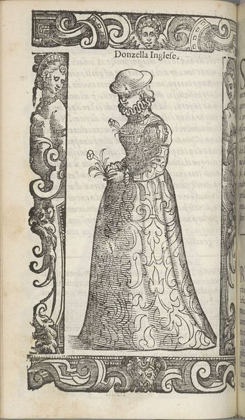 Editor: This is "Vsati in Venetia 1550," an engraving by Christoph Krieger from 1598. It depicts a woman, her form dominated by a large gown and veil. There's a sort of formality to the whole thing, rigid even, wouldn't you say? What story do you think this image is trying to tell? Curator: Story is an interesting word here, I feel a connection to ritual. To me, the beauty here resides in its stark depiction of status, filtered through the engraver's own cultural lens a few decades later. That frame, with all those gargoyle-esque decorations – isn't it delightfully morbid? Like vanity given monstrous form! Do you sense how Krieger's clean lines manage to both define and almost erase the individual woman? Editor: Absolutely! It's like she's being consumed by the visual language of status. And that veil... almost suffocating. Curator: Exactly. Perhaps the woman isn't the subject at all; rather, it's Venetian society’s performance of wealth, codified and, ironically, trapped within the pages of a book. Doesn’t that strike you as just a little…sad? Editor: It does now! I hadn't really considered that it could be a commentary, more than just a portrait. It shows how art can kind of whisper secrets across centuries, doesn’t it? Curator: Precisely! Every line, every shadow hums with intention. The piece serves as a mirror reflecting not only a moment, but our enduring fascination (and often, entanglement) with appearances.