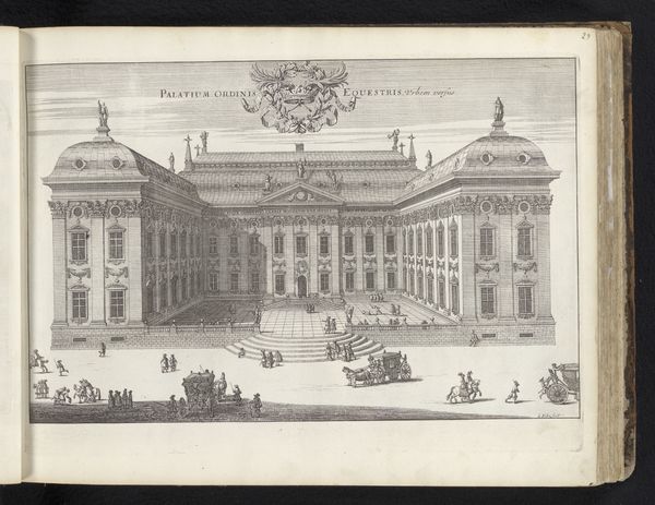 Curator: This is a striking image, isn’t it? What do you make of this "Gezicht op het Capitool te Rome," or View of the Capitoline Hill in Rome, from the 18th century? Editor: Austere. Everything about the rendering of this architectural space speaks of authority and formality. Even the little people are more like carefully positioned pieces on a board than actual figures populating the landscape. Curator: Well, you’ve put your finger on something interesting: authority. The Capitoline Hill has been a symbol of Roman power since antiquity. This image, currently held at the Rijksmuseum, presents it as this perfectly ordered and balanced vision, harking back to the Baroque emphasis on classical ideals and power structures. What is being expressed visually through such emphasis? Editor: I think that visual expression equates to permanence. The rigid perspective, the unyielding symmetry... they create an impression that Rome and its authority are timeless and immutable. This wasn’t just a depiction of a city; it was a statement of Roman resilience at a moment of shifting political powers throughout the 1700s. A perfect image for promoting papal supremacy. Curator: Exactly. The imagery taps into deeply rooted ideas of Rome as the center of civilization and law. The arrangement itself creates an almost mythic space. Consider how the buildings flanking the staircase serve like parentheses or stage wings leading us to the towering Palazzo Senatorio as a narrative. Editor: And those symmetrical staircases almost act like the arms of power, don't they? They lead towards that focal point where secular power resides but with that heavy suggestion of spiritual legitimacy. What I find interesting here, even beyond this statement about lasting dominance, is the almost surreal flatness of it. Curator: Surreal? In what sense? Editor: Everything feels deliberately flattened, the perspective just a touch too formal. It makes the whole scene appear like a meticulously arranged stage set and it speaks volumes about the nature of control—how the city itself is, in effect, a set piece in the theater of Roman dominance, arranged as much to inspire reverence as to project practical power. Curator: A very astute observation! It reveals that visual order isn’t merely aesthetic; it’s a manifestation of ideological order, meant to impress upon the viewer Rome's centrality in the world, as eternal and enduring. Editor: Which leads me to consider, how effective are these declarations through aesthetics today? In a world saturated with diverse ideologies and forms of visual expression, how do historical images like these function—still powerfully, or as beautiful but antique testaments to times long past?