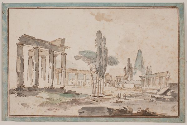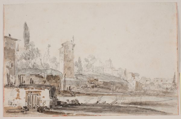Wigerus Vitringa created this river landscape drawing with watercolor and pen and ink. Note how the composition is structured by the horizontal expanse of the river against the vertical architectural ruin on the left. The subdued palette of browns, blues, and greens evokes a serene and pastoral setting, yet the scene is alive with the activity of people and animals crossing the river. The ruin acts as a framing device, drawing the viewer's eye toward the figures on the ferry, which is rendered with great detail and a sense of depth. Vitringa masterfully uses light to define form and texture, from the rough stone of the ruin to the soft reflections on the water. This interplay of light and shadow creates a nuanced atmosphere that is both inviting and subtly melancholic, reflecting perhaps on the passage of time. The subtle balance between the architectural stability and the fluid movement of the river highlights a dynamic relationship between permanence and change. This contrast invites us to consider how we, too, navigate the currents of life amidst enduring structures.
