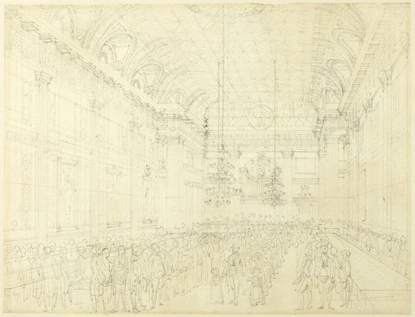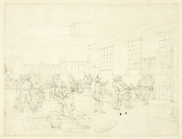 Editor: This is Augustus Charles Pugin’s "Study for Workhouse, St. James' Parish, from Microcosm of London," made around 1809, using graphite, etching, and paper. It’s fascinating – it looks like a preliminary sketch, but it’s so detailed! What strikes me most is how the light falls across this crowded interior. What do you see in this piece? Curator: Well, first, it's important to situate Pugin's work within the social fabric of early 19th-century London. Workhouses, often justified by Malthusian economics, were sites of immense social control, effectively imprisoning the poor. Doesn’t the skeletal nature of the drawing itself speak to this reduction of human life? Editor: Absolutely, I see that. So, it's not just a study of light and space, but also a commentary on poverty? Curator: Precisely. Consider how Pugin's style – deeply rooted in neoclassicism and academic art – often masked sharp social critiques. His drawings become interventions. How can we reconcile the apparent objectivity of architectural rendering with the abject conditions depicted? What tensions arise from that contrast? Editor: That’s really powerful. The architectural rendering, with its precision, almost legitimizes the workhouse, yet the scene itself… Curator: …speaks of the dehumanization inherent in the system. Also, the etching lines give texture not only to walls, but to their lives inside that make the poor seem faded. Look how space is given only to the columns. Editor: It's almost like a Panopticon in drawing form, with unseen authorities watching. Curator: Yes. The very composition reinforces the power dynamics at play. It invites us to consider how visual representation can both conceal and reveal injustice. Do you find this relevant in today's social and political landscape? Editor: Definitely. It's a reminder that art can be a powerful tool for exposing the hidden structures of oppression. Thank you! Curator: My pleasure. And it serves as a call for constant questioning of the systems that perpetuate inequality, urging critical engagement with visual culture.