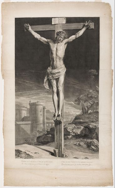Curator: This drawing, “Christus aan het kruis,” made by Jan Thomas, sometime between 1627 and 1678, is an engraving rendered in charcoal and pencil. What strikes you immediately about it? Editor: The overwhelming feeling is bleakness. It’s monochromatic, shadowy—the body is emaciated and suspended against a truly dark backdrop. You feel the suffering intensely. Curator: Yes, and notice how the medium contributes to that effect. Thomas chose charcoal, a relatively inexpensive and easily accessible material. Engravings, even though printed and reproducible, often made art more available across society. This contrasts with the traditional associations of such a serious and important subject. Editor: Interesting point. Given the context of Baroque art, where emotional intensity and religious themes often served propaganda purposes, how do you think the availability of the medium impacts the artwork's message and target audience? Does it democratize the suffering, or does it cheapen it? Curator: I'd argue that the reproducibility, especially considering the economic realities of the time, makes the image more accessible to a wider audience beyond the aristocratic patrons of the era. We can consider where Thomas produced and circulated his prints, exploring networks of production and trade that would help us better assess his audiences. Editor: Agreed. And in light of accessibility, note the sign above Christ. "INRI", a common element in crucifixions, but how would that text have been read then? Who was that messaging for? Who was being excluded from it? Curator: Placing it within broader social narratives and highlighting inherent power structures invites conversations about marginalized identities and silenced voices. The figure of Christ on the cross, and images like this one, became touchstones in liberation theologies worldwide precisely because of that enduring visibility, materiality, and availability. Editor: Exactly. Ultimately, this piece, viewed through the lens of intersectionality, urges a discussion about history, representation, and who gets to participate in the narrative. Curator: Indeed, while the artist made intentional material choices, context keeps opening avenues for thinking about the work’s continued power. Editor: Precisely. Its somber strength pushes us to face the complex intersection of production and access, history, and the realities it seeks to represent.