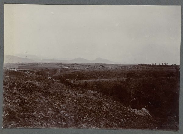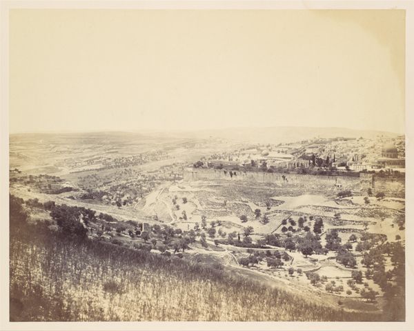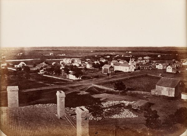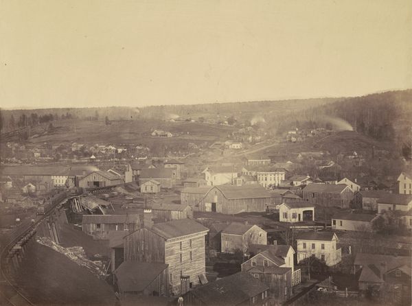 Editor: So, this is "Providence, Del. & Hudson Canal Co." a gelatin-silver print made sometime between 1863 and 1865 by Thomas H. Johnson. It's a muted scene... makes me think of simpler times, even though the light is sort of somber. What stands out to you? Curator: What catches my eye immediately is how Johnson frames a community in transition. Observe the deliberate layering – the wild foreground, the carefully placed houses and buildings, and the distant hills. It's a powerful symbol, wouldn’t you agree, of humanity asserting itself on the landscape? A delicate balance between the untamed and the settled. Do you think Johnson romanticizes this balance, or does he hint at something else? Editor: That’s interesting… I hadn’t thought about the tension. The landscape looks still, like something is missing or about to change. The shadows are certainly looming. Curator: Exactly! The photograph seems to subtly suggest a specific, loaded symbolism. What happens when progress reshapes cultural memory? Do the houses then represent stability, aspiration? Is the canal an emblem of the future…or does its presence portend a potential disruption of this balance? Consider the emotional impact tied to place – the weight of memory embedded in every stone and tree. Editor: I see what you mean. I was mostly drawn to the historical feel, but there's a lot more happening symbolically than I first realized. The composition, with its layers of civilization, nature, and distant promise makes it both hopeful and, as you said, disruptive. Curator: It's about holding multiple meanings simultaneously. The beauty of the photograph resides in the quiet, unspoken dialogue it begins with us, the viewers. We project our understanding onto these symbols, continuously re-interpreting its value through modern eyes. What a responsibility, don't you agree?