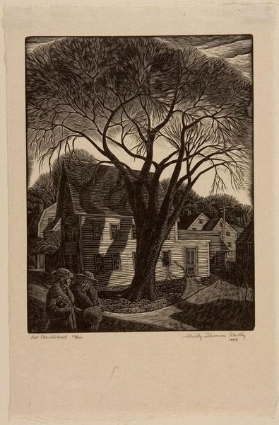 Daniel Garber made this etching, titled ‘River House’, sometime in the first half of the twentieth century. It’s a scene of domesticity rendered with a fine network of lines, like tiny hairs that form an image. You can see Garber’s process in the hatching and cross-hatching, the density of which creates areas of light and dark. Look at how the tree dominates the composition. Its massive trunk and sprawling branches create a screen, partly obscuring the houses behind. The branches remind me of veins, or rivers themselves, echoing the title. This foreground tree is rendered with so many lines. It's almost as though the artist is trying to capture not just the shape of it, but also its rough texture, the feeling of its bark. There is a dialogue with artists like Whistler. Garber’s work invites us to slow down, to notice the beauty in the everyday, and to appreciate the artfulness in simplicity. It's not about grand statements, but quiet observations, proving that art is an ongoing conversation.