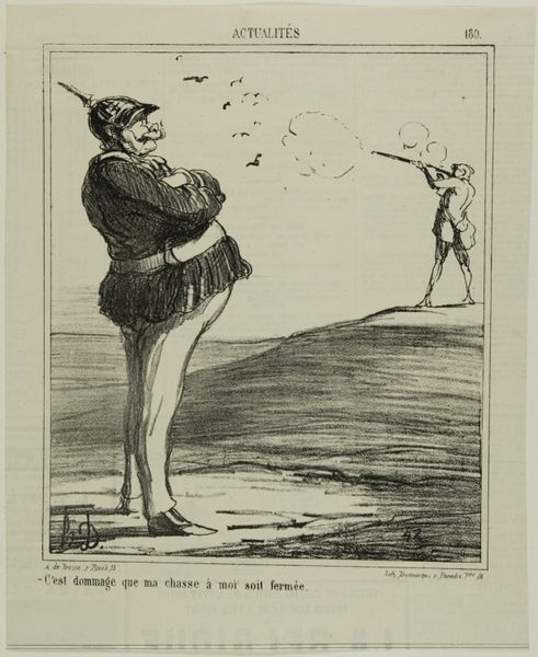 This political print was made by Johan Michaël Schmidt Crans in 1861, using a technique called etching. This involves drawing an image into a waxy ground on a metal plate, then using acid to bite away the exposed lines, creating an image that can be inked and printed. Note the contrast between the clean lines of the figure, representing the departing minister F.A. van Hall, and the more chaotic, scribbled lines of the landscape. This contrast not only creates visual interest but also mirrors the political turmoil of the time. Etching allowed for the relatively quick production of images. This was important for political cartoons, which needed to be timely to be effective. The very process of etching, with its reliance on chemical reactions and mechanical reproduction, speaks to the industrializing world in which this image was made. Consider how the choice of materials and techniques is crucial to its meaning and impact. By understanding the making, we gain deeper insight into the social and political context of the work.