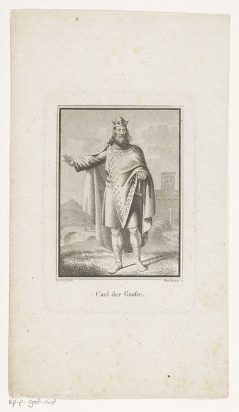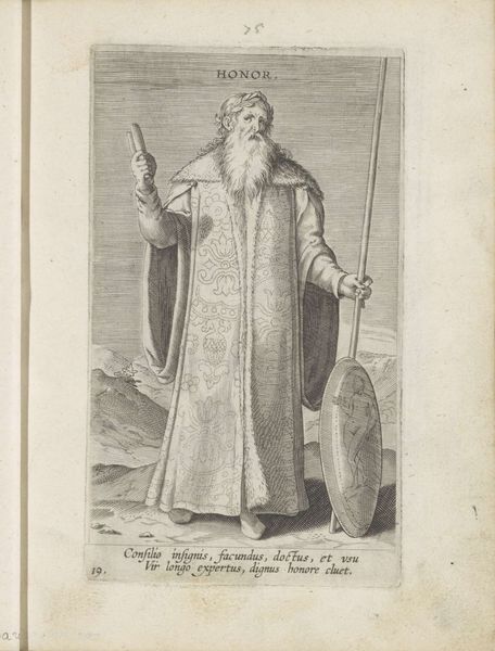 Philips Galle made this engraving called 'Vreze Gods' sometime before his death in 1612. Engraving is a printmaking technique where the artist carefully carves lines into a metal plate, inking the lines to transfer the image onto paper. The visual power of this image lies in Galle's mastery of line and tone through this printmaking process. Notice the intricate details in the figure's garments, the texture of his beard, and the subtle gradations of light and shadow. These are all achieved through the careful control of the engraving burin. What's remarkable is how a linear process can evoke material substance: the weight of the stone tablet, the fabric of the garments, the metallic gleam of the trumpet. In this way, the work exemplifies the capacity of printmaking to communicate far more than just visual information. It speaks to broader cultural values and beliefs about religion, law, and judgement that would have been circulating at the time the work was made. This reminds us of the importance of considering not just what an image represents, but how its very making informs its meaning.