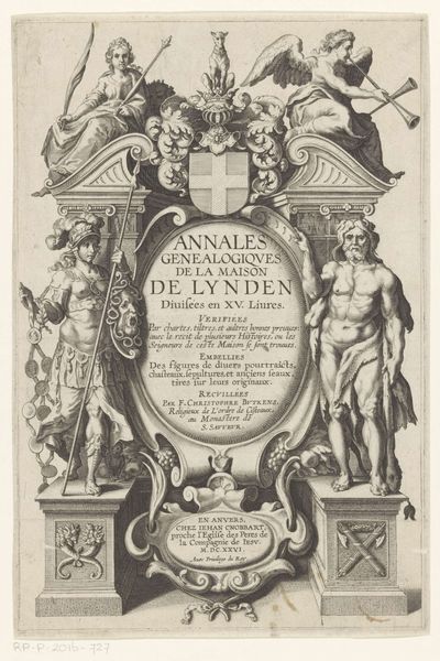 Curator: Abraham de Bruyn created this elaborate title page for a book of equestrian arms from across the globe back in 1577. It’s an engraving, part of the Rijksmuseum's collection. My initial sense? Controlled chaos. The frame is classical, almost stoic, but it's bursting with figures—centaurs, gods, horsemen. A very dense composition. Editor: Absolutely. The classical architecture provides a stable foundation, yet the mythical and martial figures create a dynamic tension. It feels representative of its time, a very humanistic moment where classical ideals were being used to process an expanding world. Those figures on horseback, literally astride different cultures, speak to that moment of encountering the 'Other'. Curator: Precisely! Consider the centaurs—beings caught between man and beast, symbolizing a sort of liminal space. They straddle the upper register of the title page, literally mediating between worlds. And the central text, the title, is framed by muscular, godlike figures representing perhaps strength or the taming of nature. It’s a careful ordering of perceived chaos. Editor: And the equestrian theme, recurring with the horsemen below flanking a small inset image. Equestrianism carried such weight – military prowess, aristocratic bearing, power and control. To present the customs from Europe, Asia, Africa and America in this framework isn't simply descriptive, it's implicitly making a statement about their standing relative to one another, under the guise of 'equitandi ratio'. Curator: You make an astute point about that "equitandi ratio," the manner of riding, subtly ranking cultures based on European sensibilities. Yet the inclusion of diverse figures, though viewed through a European lens, hints at the era’s burgeoning curiosity and expansion of awareness beyond its traditional borders. This is a period when the known world was rapidly expanding. Editor: A visual rhetoric typical for early modern attempts to catalogue, categorize, and control narratives around global encounters. The book itself would have been used to visually consume distant lands, reducing their rich diversity into digestible, and manageable imagery for the European gaze. Curator: It’s fascinating how much a single title page can reveal about a culture's self-perception and its attitude towards the wider world. It prompts us to see how symbols, even when seemingly straightforward, can conceal layers of complex meanings. Editor: Indeed. An exquisite artifact offering insights into the socio-political climate and aesthetic conventions during this crucial era of global engagement.