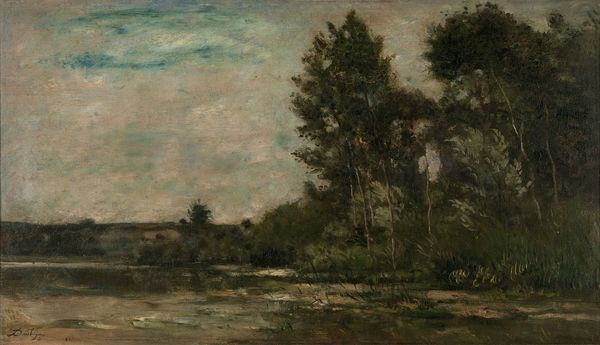 Editor: Here we have Paul Cézanne’s “Bend in the River,” created around 1868 using oil paint. The thickly applied paint and dark tones create a somber, almost brooding, atmosphere. What catches your eye most about its composition? Curator: Initially, I’m drawn to the stark contrasts. Consider the horizontal thrust of the river against the rugged, almost vertical, ascent of the bank. There's a tension there, wouldn’t you agree? The layering of brushstrokes creates a surface alive with texture and movement, yet the overall effect is one of stillness. Do you observe how Cézanne manipulates light to further emphasize the forms? Editor: Yes, I notice how the light glances off the tops of the trees, highlighting their structure against the darker mass of the hillside. It’s not a traditional, idealized landscape, is it? Curator: Indeed. Note the near absence of classical perspective, replaced by a preoccupation with mass and form. Cézanne’s departure from academic conventions is evident in his construction of space through colour and texture, anticipating later cubist strategies. Observe the solidity of the masses – the land, the trees, the water – rendered with such palpable presence through impasto and nuanced tonality. How might you interpret this in the context of his artistic development? Editor: So it's less about accurately depicting a scene and more about exploring the building blocks of visual experience itself. That's fascinating. I initially saw only darkness, but now I appreciate the interplay of textures and how that dictates the depth. Curator: Precisely! Seeing the canvas not merely as a window but as an object of its own materiality allows a richer reading. Editor: This formal analysis provides such a different way to appreciate Cézanne’s experimentation. It moved beyond simply 'capturing' the light of Impressionism into investigating structure. Curator: Understanding how an artist manipulates these formal elements provides a language with which we can unlock deeper meanings within a work.
