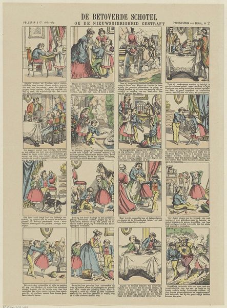 This is a printed sheet titled ‘Michel en Dominikus / De kleine dieven’ or ‘Michel and Dominikus / The little thieves’, made by Olivier Pinot. The artist was working in an era when the printing press had become a powerful tool for mass communication. This sheet is made of paper, using a lithographic process to transfer each frame of the story onto the page, and then hand-colored. Its physical qualities give us clues about its social context: the paper is cheap and light, suggesting that this was a widely available and affordable form of entertainment. Looking closely, you can see how the artist used simple lines and bright colors to bring the characters to life. The narrative unfolds in a series of small scenes, each with its own little caption. It’s almost like a comic strip from the 19th century. By using the medium of print, Olivier Pinot was able to reach a large audience and share stories with people from all walks of life. This challenges the idea that art has to be precious or exclusive.