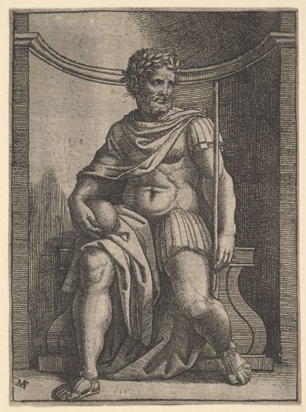 René Boyvin created this print, "Bust of a Man Wearing a Fantastic Head-dress and Mask," in the 16th century. Immediately striking is the elaborate head-dress, teeming with symbolic figures and ornamental details. The artist's intricate engraving technique renders a complex layering of textures and forms. Consider how this image teeters on the edge of the grotesque. Boyvin has carefully constructed a portrait that, while seemingly celebrating grandeur and power, subtly undermines it. The head-dress is so extravagant it borders on the absurd. The mask itself, though noble in profile, is weighed down and obscured by excessive ornamentation. We might see this as an early form of deconstruction, an artistic strategy that reveals inherent contradictions within established symbols of authority. Boyvin’s technical virtuosity is undeniable, but his work goes beyond mere skill. The tension between the figure's stoic expression and the whimsical details of the head-dress invites us to question fixed meanings and to recognize the instability of appearances.