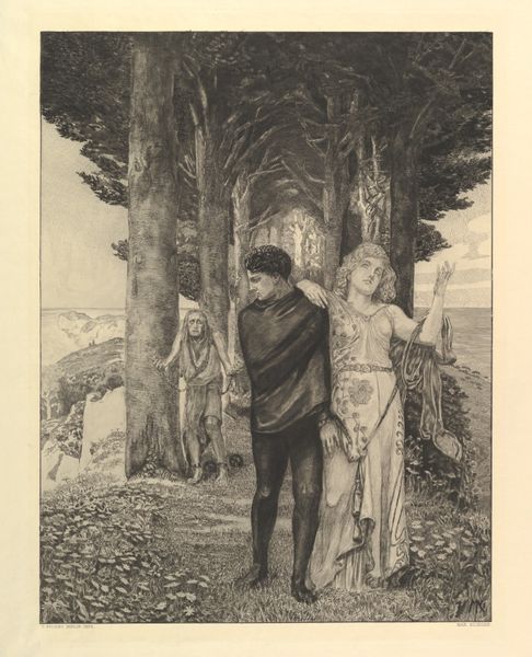 Curator: This engraving, "Abraham and Isaac" by Simeon Solomon, hails from "Dalziels' Bible Gallery" and was produced sometime between 1863 and 1881. Editor: There's a haunting stillness to this print. The delicate lines create a very palpable sense of melancholy, almost foreboding, hanging heavy in the air. Curator: Solomon’s rendering of the biblical narrative offers us a potent lens through which to explore Victorian anxieties about faith and sacrifice, particularly within the framework of familial and societal expectations. The palpable tension and grief between father and son become representative of the spiritual and emotional toll exacted by adherence to religious dogma. Editor: I see your point about religious dogma, but Solomon seems more interested in exploring a deeply intimate and tragic relationship between two figures caught in a web of conflicting duties and loyalties. I am fascinated by how the artist emphasizes the youthfulness of Isaac juxtaposed with Abraham's weary stance. What might be interpreted through a queer theory lens? Curator: Exactly. Queer readings open up dialogues around alternative representations of masculinity and the complexities of male bonds, disrupting traditional heteronormative interpretations of the story. Consider how the pre-Raphaelite aesthetic intersects with homoerotic undertones that challenges Victorian conventions. It disrupts what compulsory heterosexuality should look like. Editor: This work gained traction at a time when printed images circulated widely, influencing public opinion and shaping perceptions of historical and religious narratives. The distribution networks would have reached many people. Curator: Placing this print within the larger socio-political context of Victorian England reveals the pervasive influence of religious ideology and its profound impact on individual lives and interpersonal relationships, themes which sadly continue to resonate today. Editor: Ultimately, Solomon’s work stands as a potent meditation on faith, obedience, and the enduring bonds of affection tested by impossible demands. Curator: Agreed. A painful and tragically relevant visual poem on patriarchy.