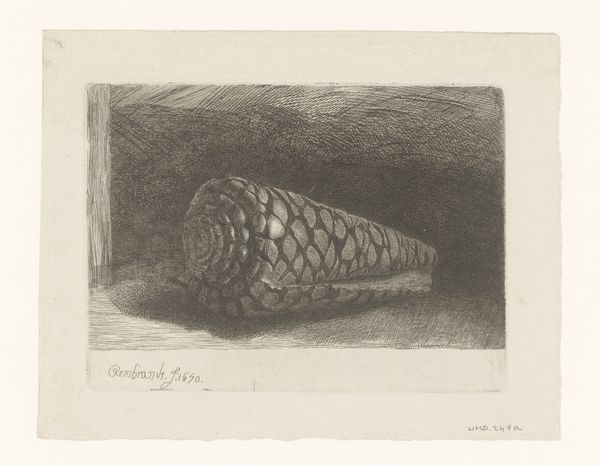 Rembrandt van Rijn’s etching of 'The shell 'Conus Marmoreus' presents a study in contrasts, achieved through a mastery of light and shadow. The conch shell sits prominently in the foreground, its patterned surface meticulously detailed. The artist’s formal technique is evident in how he uses line and texture to describe form. Rembrandt’s use of chiaroscuro, the interplay between light and dark, transforms the mundane into the remarkable. The varying density of lines creates areas of deep shadow that sculpt the form. He employs a semiotic system of signs, where light signifies visibility and knowledge, and shadow hints at the unknown. The stark contrast between the intricate details of the shell and the murky background invites questions about perception and reality. The artist challenges fixed meanings by imbuing a humble object with profound visual interest. The print functions aesthetically and as a philosophical exploration of the visible and the obscure.