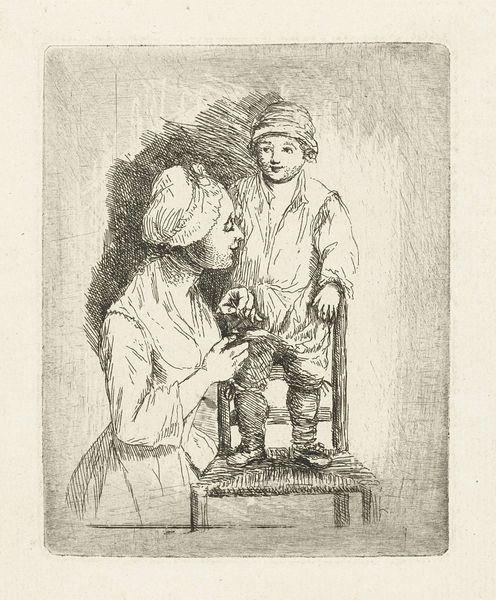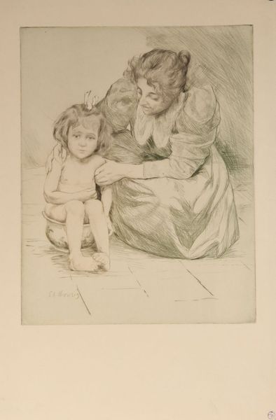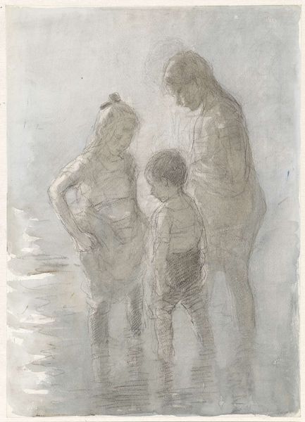 Curator: What a striking composition. I immediately sense a quiet, watchful mood. There's a tension between the intimate family moment and a sense of something larger, perhaps societal, pressing in. Editor: Indeed. We are looking at "On the Beach", a pencil drawing created in 1936 by the artist John Langley Howard. It offers a window into family life during the Depression era in America. Howard's technique lends a certain gravitas to the scene. Curator: Absolutely. The pencil work is so detailed, almost photographic in its realism. It speaks to the human need for connection during times of economic struggle. Notice how the father's gaze is fixed outward, protective, while the mother observes the children. It echoes the classical Madonna image. Editor: And consider the children playing near the water's edge. Their innocence serves as a poignant contrast to the hardship undoubtedly felt by the adults. This highlights a recurrent theme of the New Deal era. These representations were thought to bring comfort to the working class who saw images of their lives depicted and validated through art. Curator: I'm drawn to the beach itself, an archetypal symbol of the liminal space, the border between safety and the unknown. Water, of course, holds myriad symbolic meanings—cleansing, danger, renewal. The family stands at that precipice. It invites a broader societal commentary beyond merely showing daily life. Editor: Precisely. The seemingly casual details—the toy, the discarded bottle—acquire a symbolic weight in this context. Each element whispers of everyday struggles and small comforts. But this art can also reveal a more global and ideological undertone of promoting a traditional model of family in a time when many such ideas were transforming, shifting the artwork toward social propaganda. Curator: I can agree. The drawing is layered with such potent iconography, creating an image that invites both personal introspection and socio-historical analysis. What this artist represents is an emotional story about a period and family's ability to find intimacy in such difficulty. Editor: "On the Beach" is more than just a snapshot. It prompts us to consider the relationship between family, adversity, and the subtle, yet powerful ways in which art can reflect and shape societal values.
