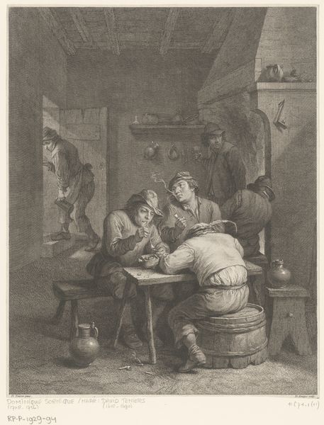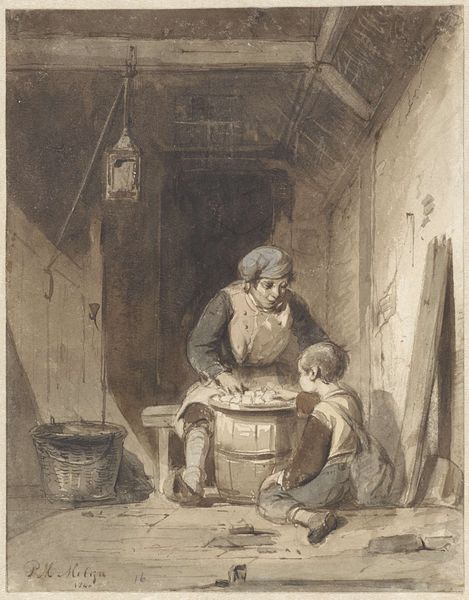 Editor: This watercolor, charcoal, and pencil drawing from Ary Scheffer, titled "Sick Man in Bed with a Woman and Two Children", dating from 1805 to 1858, evokes a sense of profound sorrow and unease. The figure in the doorway especially captures my attention and the symbolism here is striking. What do you see in this piece? Curator: I see a powerful representation of societal anxieties surrounding mortality, framed within a Romanticist lens. Note the figure entering on the left, draped entirely in black; what emotion does this convey for you? Editor: Fear. Loss. It looks like death is visiting. The use of shadows is haunting, but it contrasts against the brighter, softer forms around the man on his deathbed. Is this common of Romanticism? Curator: The Romantics often grappled with these contrasts. Scheffer masterfully uses visual symbols, the looming darkness of Death vis-à-vis the family's illuminated grief, a technique echoing medieval allegories of the Grim Reaper. What emotional narratives are conveyed by their gestures and gaze, would you say? Editor: The woman's clasped hands speak of prayer, of supplication. The children are more varied: one reaching for the approaching figure in the doorway, the other contemplative or cautious. Is the child's reach a symbol for innocence and naiveté? Curator: Precisely. This contrast enhances the viewer's experience: the cultural weight and memory are palpable, a meditation on both vulnerability and hope in the face of inevitable loss. Note the subtle use of light directing us through the scene towards both comfort and despair. What does this artistic intention imply for the artist, Ary Scheffer? Editor: He's asking us to contemplate not only death, but life, love, and acceptance of destiny. Thank you, this opened up the drawing’s depths. Curator: Indeed. It encourages introspection on timeless themes through art.