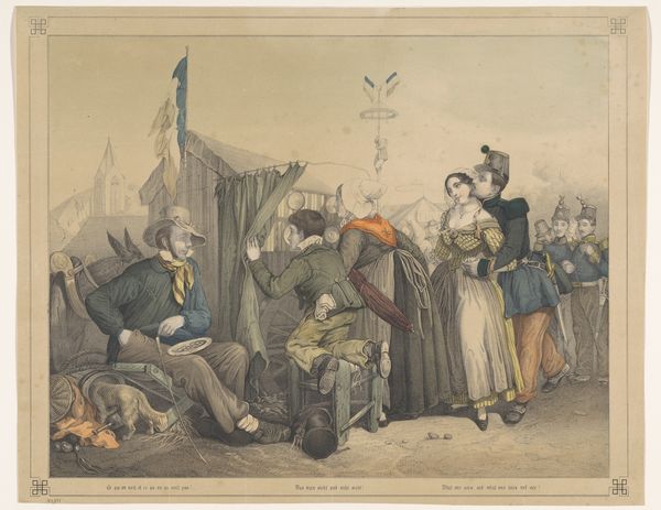 Curator: Johann Heinrich Ramberg’s 1797 drawing, “Bänkelsänger auf der Piazetta in Venedig,” captures a scene at the Piazza San Marco, rendered in ink and colored pencil on paper. Editor: It's instantly striking—the muted palette lends a sort of melancholic, almost ghostly atmosphere. And the composition, crowded as it is, somehow feels…dynamic? Like a captured moment in time. Curator: Ramberg’s technique is noteworthy. The detailed linework, particularly in rendering the figures' clothing and expressions, contrasts with the softer washes that define the architectural backdrop. You can almost feel the texture of the paper beneath the varying pencil strokes. The commercial vendors in Venice at the time would've provided the material conditions that shaped street performances as popular entertainment, drawing everyone in together through art and economic transactions. Editor: It's fascinating to consider the social dynamics. Look at the clear stratification: the more affluent observers standing back, detached, while others seem caught in the thick of it. The Bänkelsänger, essentially a ballad singer, serves as the focal point, disseminating narratives. It begs the question: whose stories are being told here? Who is represented and how? Is this depiction empowering or exploiting of these working class people who were providing public entertainments? Curator: The materiality and portability of the broadsheet these performers used would've been vital for the wide dispersal of these stories, often sensational and moralizing tales for mass consumption. Note too the architectural space of the Piazetta—the drawing almost flattens against the architecture as if it is another prop to be consumed along with the musical performance, a commentary on social classes during Ramberg’s time. Editor: And beyond class, think about the representation of gender. Women are present, but seemingly passive, observers, perhaps emblematic of societal roles dictated by gendered expectations and limitations during this era. Art has historically been a reflection and perpetuation of power structures, and this snapshot from 1797 offers critical insight into late 18th-century European culture through its gender, race, and socioeconomic layers. Curator: Precisely. Ramberg gives us a slice of life but with an acute awareness of the materials that enabled the construction of stories themselves: paper, pigment, and the literal stage upon which these social narratives were performed. Editor: This artwork isn't simply a pretty scene of 18th-century Venice; it’s a site for critically engaging with the historical undercurrents that still reverberate in art, labor, and politics today.