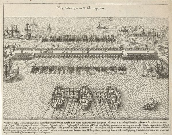 This is an engraving, made in 1585 by an anonymous artist, depicting the ship bridge constructed by the Duke of Parma. At first glance, one is struck by the rigid geometric patterns and the meticulous arrangement of elements. The composition is dominated by a series of parallel lines formed by boats and a pontoon bridge, creating a structured and almost architectural view of a military engineering feat. The linear perspective guides the eye across the water, emphasizing the ordered layout. The overall impression is one of control and precision. Looking closer, these formal elements intersect with semiotic meanings of power and engineering prowess. The bridge, a symbol of dominance, is emphasized through its repetitive structure and imposing scale. We could consider the relationship between the detailed depiction and the narrative of military control it conveys. The image, like a well-structured argument, presents a clear and persuasive case for the Duke's strategic capabilities. The engraving invites continuous reinterpretation, shaped by evolving perspectives on history, technology, and representation.